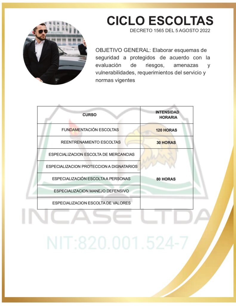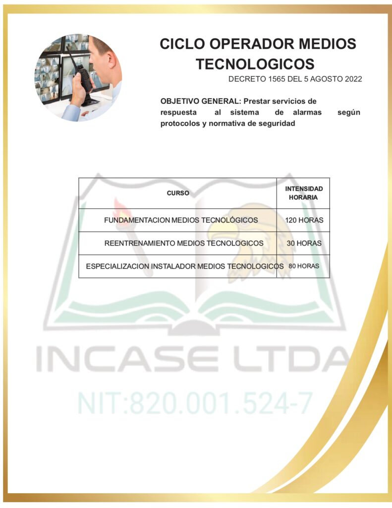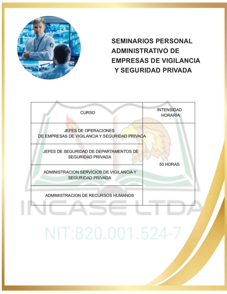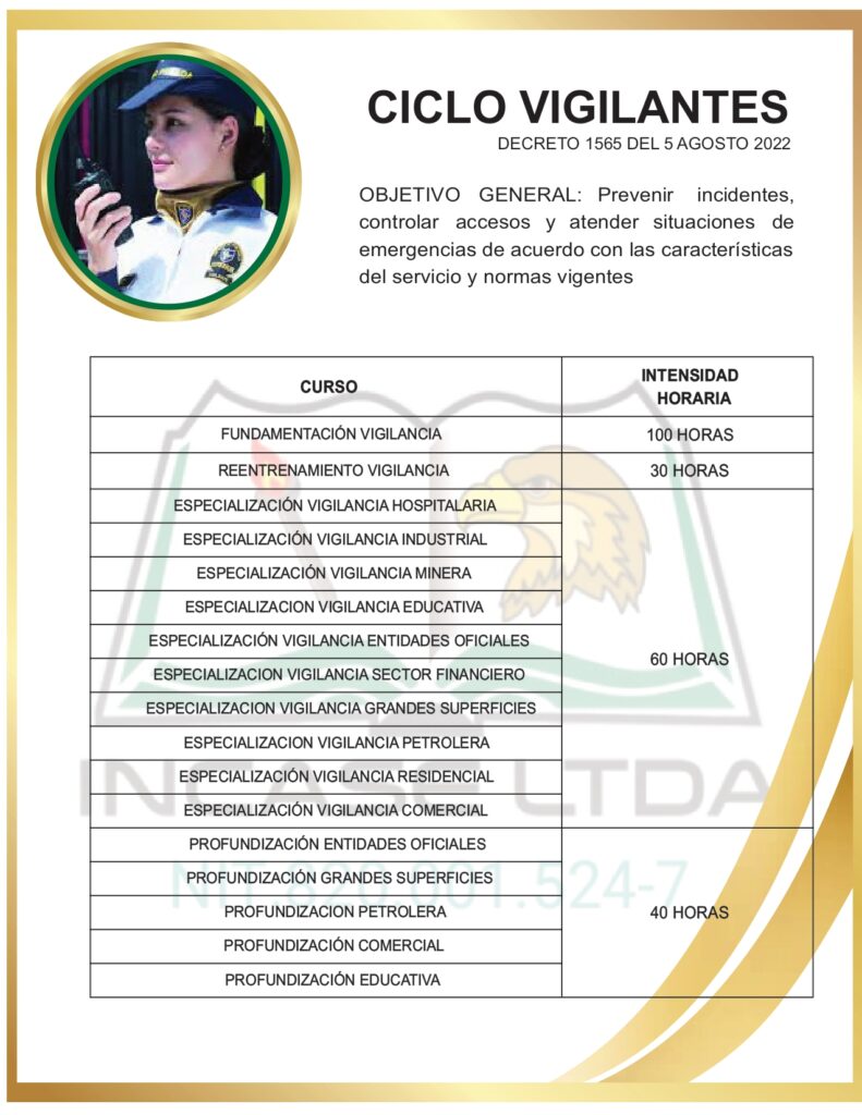 Fundamentación en Vigilancia y Seguridad Privada, ciclos ( fundamentación, reentrenamiento, especializaciones, «vigilancia hospitalaria, industrial, minera, educativa, entidades oficiales, minera, educativa, sector financiero, grandes superficies, vigilancia petrolera, presidencial, comercial, profundización entidades oficiales, grandes superficies, petrolera, comercial y educativa.