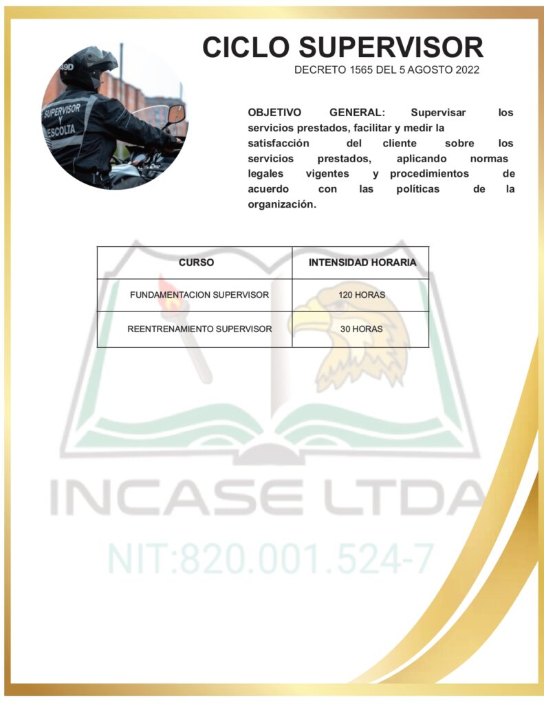 El curso de supervisor esta diseñado para formar al profesional de la seguridad privada en competencias que le permitan tener un profundo conocimiento sobre las normas de la superintendencia de vigilancia y seguridad privada, relación con las autoridades, estudio de riesgos y de seguridad en las instalaciones